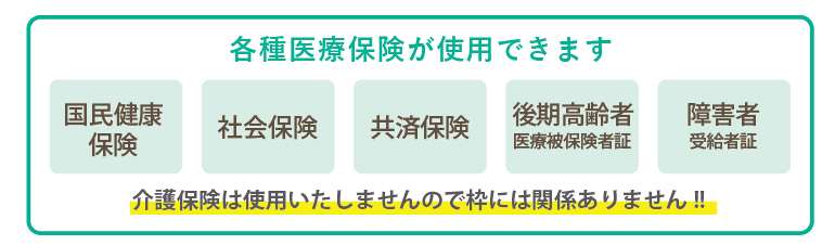 75歳以上の方は後期高齢者受給者証(1割負担)、75歳未満の方は国民健康保険(3割負担)や組合保険など、お手持ちの健康保険がお使いになれます。